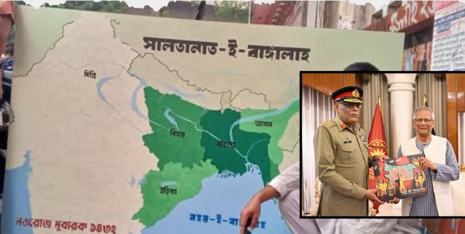 The book, titled “Art of Triumph: Graffiti of Bangladesh’s New Dawn,” was presented to General Mirza during his courtesy call on Yunus at the State Guest House Jamuna in Dhaka on Saturday. The cover image — resembling a map-like outline — has triggered controversy online, with several users alleging that it portrays Indian regions within Bangladesh’s borders.