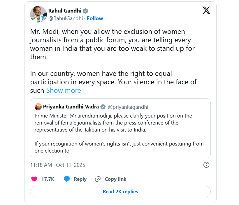 Rahul Gandhi also condemned the government’s inaction, saying, “Mr. Modi, when you allow the exclusion of women journalists from a public forum, you are telling every woman in India that you are too weak to stand up for them. Your silence exposes the emptiness of your slogans on Nari Shakti.”